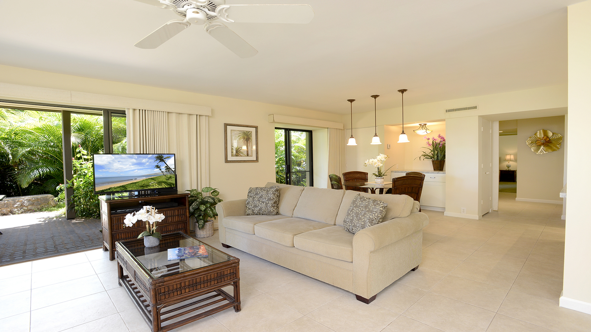 Ideal for families, couples and friendly get-togethers, the beautifully appointed one-, two- and three-bedroom condominiums offer spectacular ocean or garden views and luxury amenities including weekly housekeeping and concierge service. Each condo has a private lanai, is tastefully furnished and has a fully equipped kitchen with dishwasher and microwave as well as a washer/dryer, cable TV and A/C.